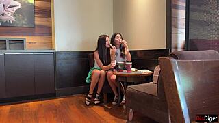 Diners sneak squeezes in corner spots, with napkins covering laps during a tease. Unique to this is the clinking glasses as background to a quiet fuck. Community comments highlight favorite eatery props. She moans when the waiter nearly spots the rub.
