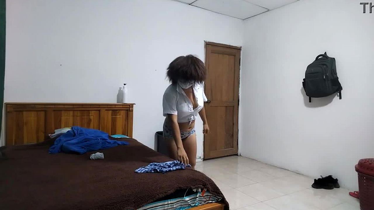 The teen college student strips in her uniform and cums hard at the party