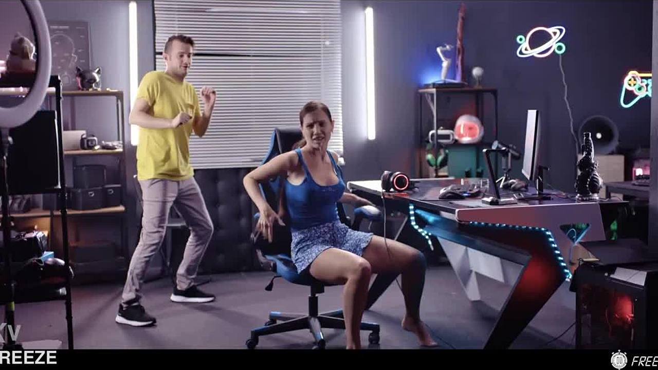 Gamer girl freezes time in lol match, gets bent over for creampie and cum swallow